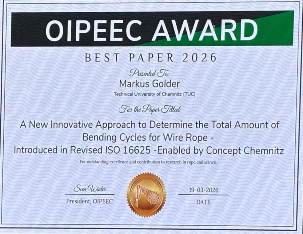 After two days of intensive discussion, we are returning to Chemnitz. An outstanding conference featuring high-level technical exchange has left a lasting impression. We were able to enrich the in-depth exploration of the world of fibre and steel wire ropes with two presentations of our own based on current research. Christoph Müller, who also was elected a full OIPEEC management board member, presented on the topic of modelling residual breaking forces. Prof. Markus Golder outlined the latest developments in crane rope standardisation. Thanks to his excellent paper and presentation, he won the Best Paper Award! We are delighted with this success and wish all participants a safe journey home and continued exciting research in the world of ropes. Thank you OIPEEC and see you next time in Stuttgart!