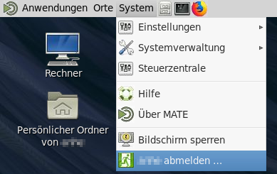 Die Sitzung kann nach Beendigung der Arbeiten über die Menüleiste in der Sitzung (System → abmelden) beendet werden. Läuft einen Sitzung weiter, verfällt gewöhnlich nach 25h das AFS-Token. Mit dem Verbindungsaufbau zu einer vorhandenen Sitzung haben wir beobachtet, dass zwar das Kerberos-Ticket erneuert wird, nicht aber das AFS-Token. Daher empfehlen wir, die Sitzung täglich zu beenden oder ein Terminal in der Sitzung offen zu lassen, um das AFS-Token mit dem Kommando aklog zu erneuern.